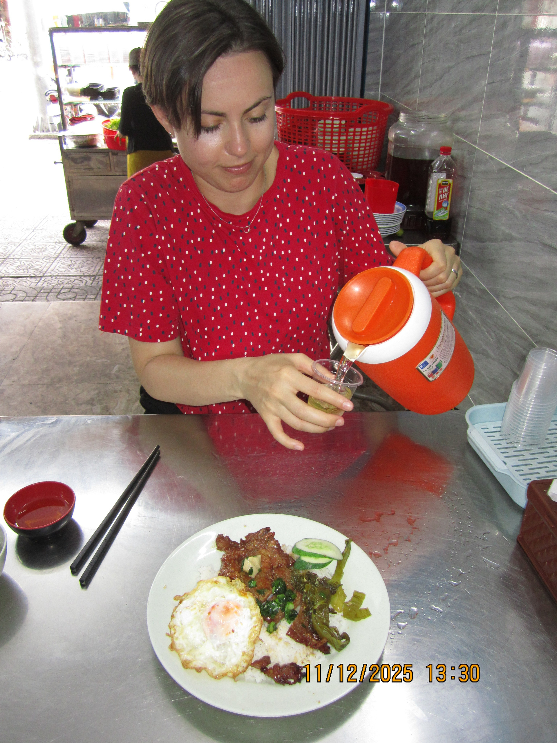 Утром Мона была уверена, что Сайгон сразу станет лучше, если она получит массаж головы. И она уже ушла. Она думала, что процедура займёт как минимум полчаса, поэтому у меня было до часа времени, чтобы проснуться и подготовиться к выходу. Я не успел почти ничего сделать, как Мона уже вернулась. То место оказалось занято. Поэтому мы решили вместе придать Сайгону более приятное лицо и решили сначала поесть. Но где и что? Здесь на каждого жителя приходится три кафешки. И мне кажется, что абсолютно каждый человек держит маленькую забегаловку или хотя бы жарит тебе колбаски “на вынос”. Если место выглядит хорошим, запах приятный и кто-то ещё приглашает внутрь, мы обычно не сопротивляемся. На этот раз мы ели что-то вкусное в маленьком месте. То есть как почти каждый раз. Вчерашние блюда были, конечно, не плохие, но всё же заметно ниже среднего по моим личным меркам.
